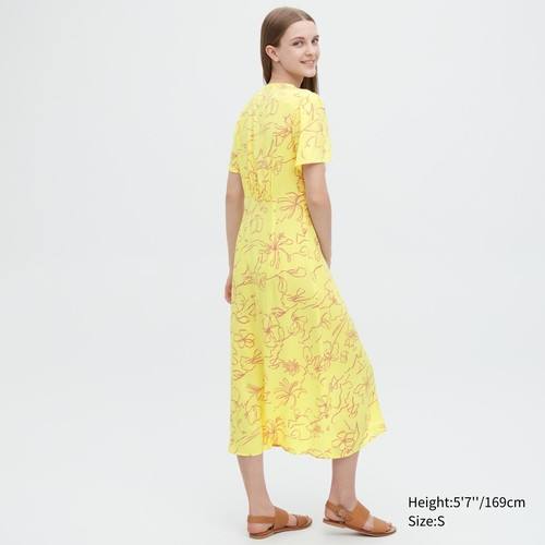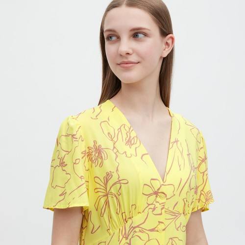 Платье с V-образным вырезом и расклешенными короткими рукавами с принтом Желтая